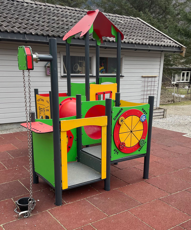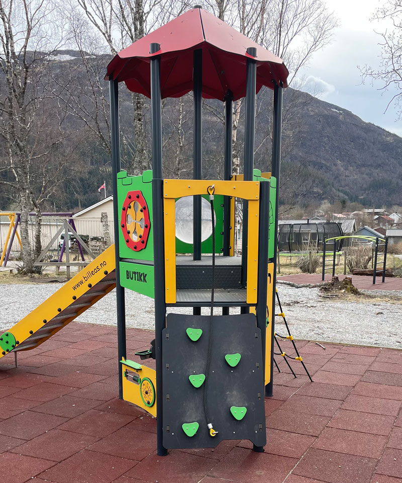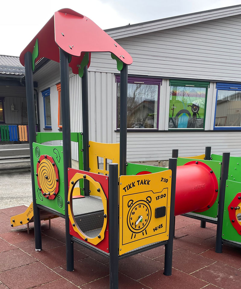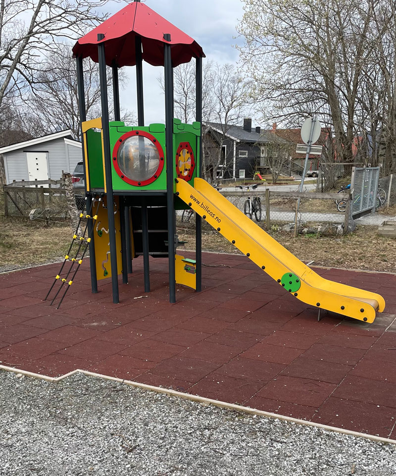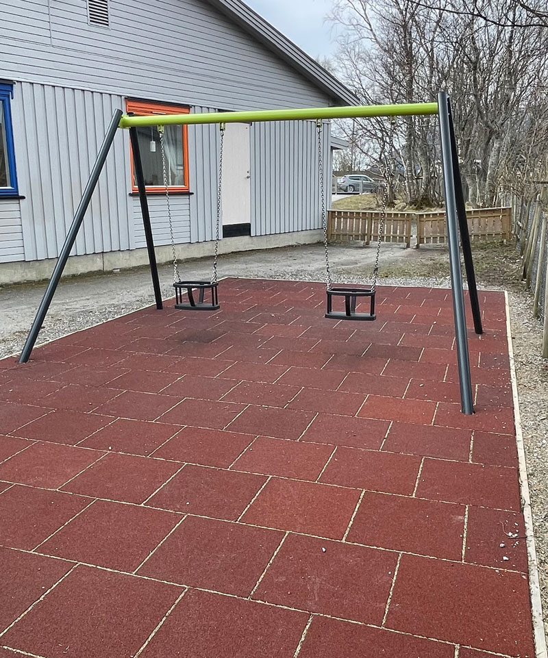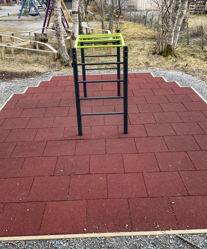 Den lokale vaktmesteren har montert og installert lekestativene og gummimattene, resultatet ble en innbydende og trygg lekeplass.