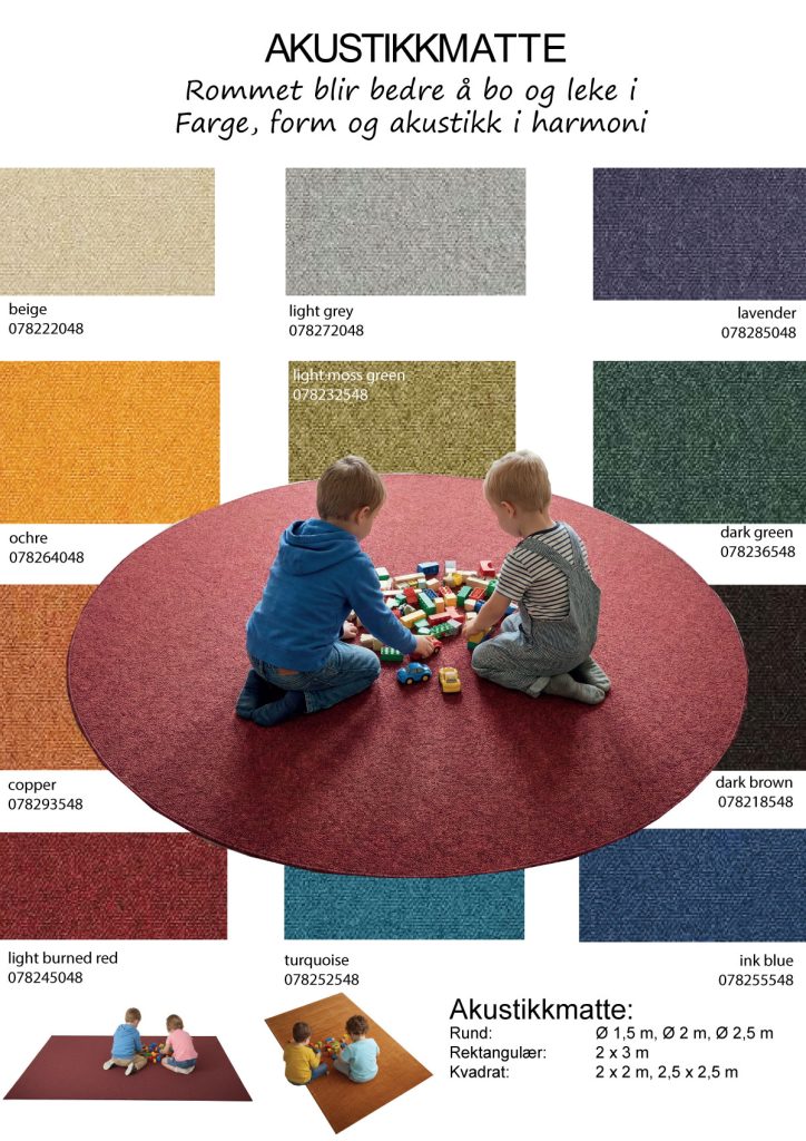 | Akustikkmatte - farger | Beige – 078222048, Blekkblå – 078255548, Kobber – 078293548, Lavendel – 078285048, Lys brent rød – 078245048, Lys grå 078272048, Lys mosegrønn – 078232548, Mørk brun – 078218548, Mørk grønn – 078236548, Oker – 078264048, Turkis – 078252548 |