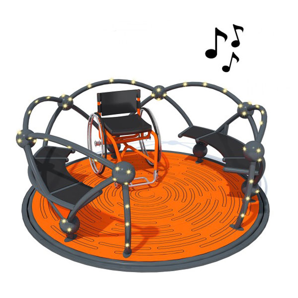 Karusellen kan brukes av én person i rullestol og seks personer som sitter på benker samtidig. Karusellen er designet med maksimal sikkerhet og komfort i tankene, og settes i bevegelse av en person som står utenfor, noe som sikrer full kontroll over leken. Karusellens moderne form, som ligner et atom, passer perfekt inn i by- eller parkområder. Den solide konstruksjonen av svart galvanisert og pulverlakkert stål garanterer holdbarhet og motstand mot værforhold. Gulvet er laget av HPL-plater.