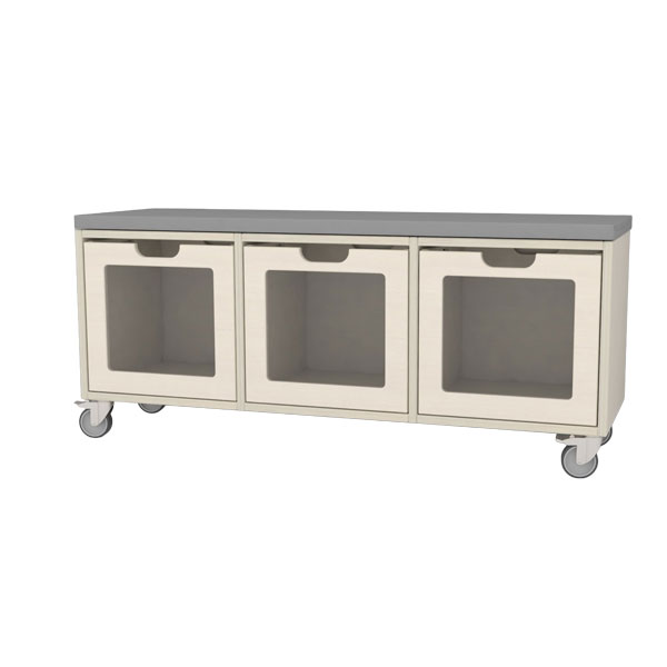 Mobil kubebenk i 18 mm hvitpigmentert bjørkekryssfiner inkl. madrass på topplate, og 3 bokser. Eskene har glass i frontpanelet, som gjør det enkelt å se hva som er i eskene og holde orden på lekene.