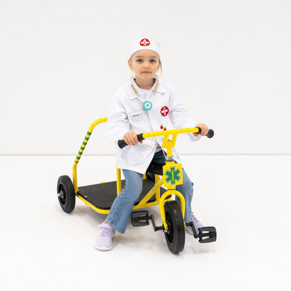 ROSE HERO Ambulanse med pedaler, tresete, tilhengerfeste og solide gummidekk, stabil base og buet styrehåndtak for sikker kjøring.