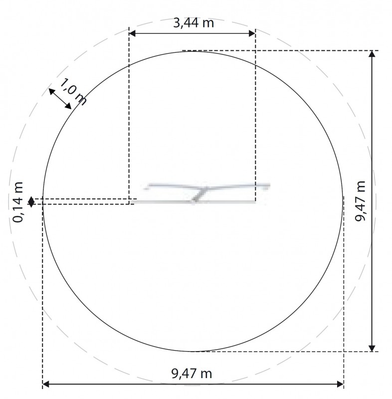 - Sikkerhetsområde: 9,47 x 9,47 m pluss 1 m for hindringsfri sone