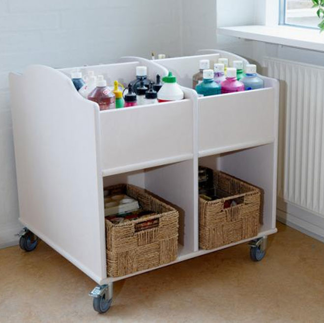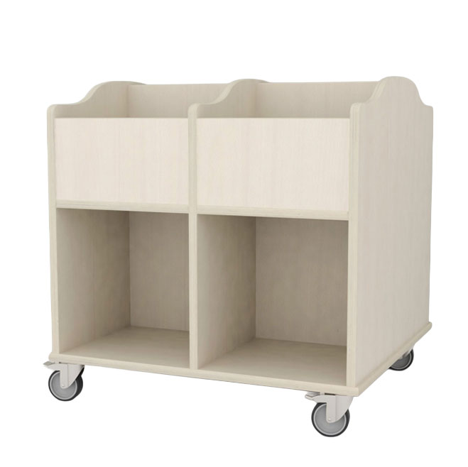 Mobil bokvogn i 18 mm hvitpigmentert bjørkekryssfiner med 8 rom.