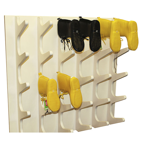 Praktisk sko og støvelvegg produsert i 18 mm hvitpigmentert bjørkekryssfiner.